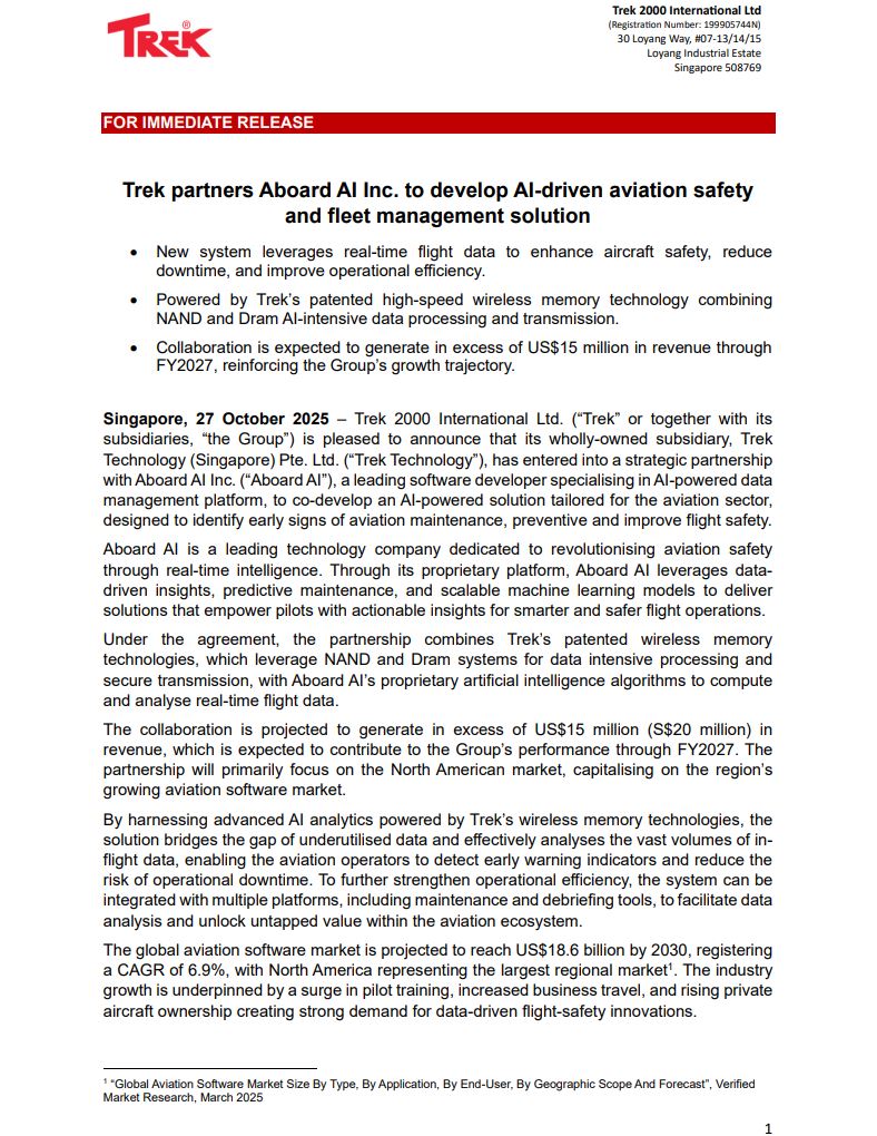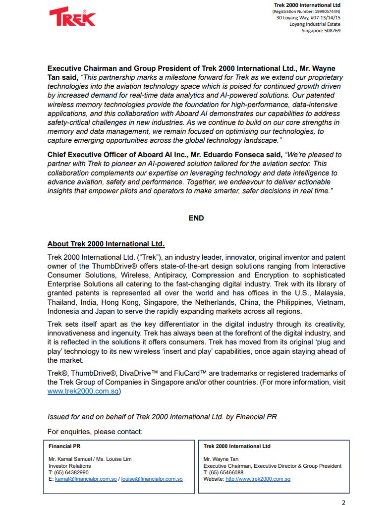 Trek 2000 International Ltd 是 ThumbDrive®(即 USB 闪存驱动器)和 FluCard® 的行业领导者、创新者、原始发明者和专利所有者,提供最先进的设计解决方案,包括交互式消费者解决方案、无线、防从盗版和加密到复杂的企业解决方案,所有这些都迎合了快速变化的数字行业。Trek 凭借其创造力、创新性和独创性,成为数字行业的关键差异化因素。 Trek 始终走在数字行业的前沿,这一点体现在它为消费者提供的解决方案中。 Trek 已从原来的“即插即用”技术转向新的无线“插入即用”功能,以及我们最新的无线“录制与播放”技术,再次保持市场领先地位。 Trek 拥有遍布世界各地的授权专利库,并在马来西亚、泰国、印度、印度尼西亚、香港、新加坡、中国、越南和菲律宾设有办事处,以有效地服务于全球不断扩大的市场。 Trek 2000 International Ltd 是一家股票在新加坡证券交易所上市的上市公司(SGX:Trek),于 2000 年和 2002 年被《福布斯全球》评为全球最佳小型公司之一。Trek 2000 International Ltd 还被评为被《亚洲货币》(欧洲货币)评为新加坡最佳管理小型公司。 Trek 还获得了 2008 年新加坡发明奖; 2011 年东盟商业创新奖、2013 年亚太企业领导奖创新精神奖和 2014 年 SD 协会领导奖。Trek®、ThumbDrive® 和 FluCard™ 是新加坡 Trek Group of Companies 的商标或注册商标和/或其他国家。作为行业领导者,Trek 2000 International Ltd 不断突破数字行业创新和创造力的界限。